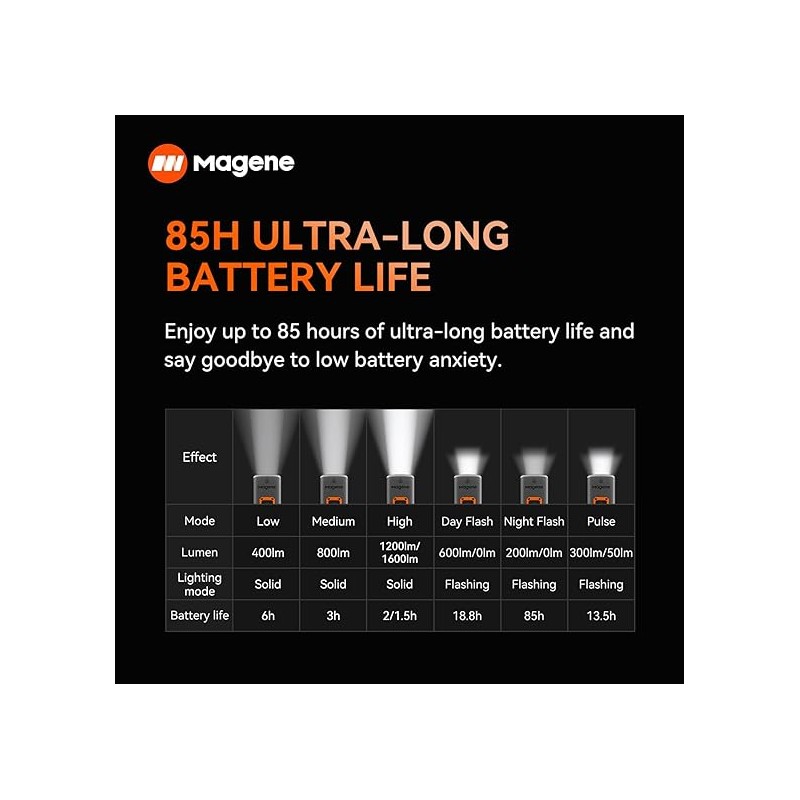 El faro para bicicleta AT1200 está equipado con una batería recargable de alta capacidad de 5000 mAh y está equipado con un puerto de carga tipo C, que tarda aproximadamente 2,5 horas en cargarse por completo y también admite descarga externa. Batería de duración ultralarga de 85 H, reduce la ansiedad por batería baja